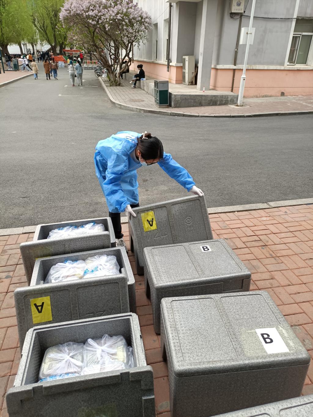 哪里最困难,党旗就在哪里。宿舍楼内没有电梯,物资搬运和发放很困难。党员志愿者毫不犹豫,勇敢地接过最艰辛的任务,坚守在宿舍楼门口搬运生活物资和防疫物资。每一份盒饭,每一瓶水,每一个口罩,每一份物资从卸车到发放到同学们手中,都是她们辛劳的付出。每个配餐箱、每箱防疫物资近百斤,男生搬起来都很费劲,志愿者队伍里有很多女同学,每天物资发放她们要负重爬楼十几趟,即便皮肤因消毒液频繁消杀而胀痛,身体因持续体力工作腰酸背痛,她们从没有抱怨和退缩过,始终战于一线。