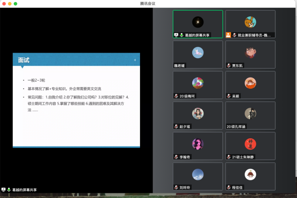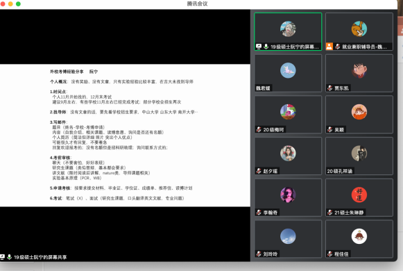 会上五位优秀研究生代表分别从升学、公考、企业、医疗事业单位四个方面为同学们带来干货满满的就业分享。考取山东大学博士的阮宁从个人概况、考博时间、选导师、考试形式等方面为大家分享了考博经验;签约江西定向选调的刘玲玲从选调生政策了解、招考一般流程、考试科目及成绩核算、笔试行测备考、笔试申论备考、面试备考等方面为大家分享了公招考试经验;签约著名药企药明康德的葛越从获取招聘信息、投递意向岗位、面试等方面为大家分享了入职公司的经验;入职西安交通大学第一附属医院的唐榕从信息获取途径、考核内容方面为大家分享了医院招聘的经验;签约黑龙江定向选调省直岗位以及济南某三甲医院的SexAV