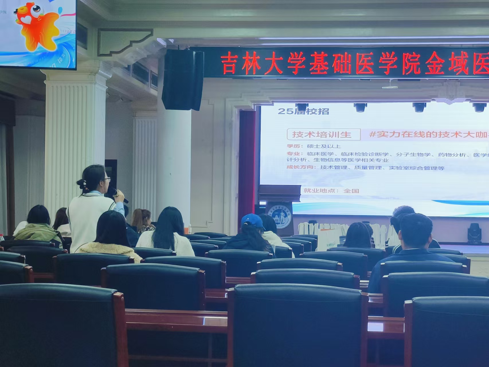 校友、吉林金域市场部血液肿瘤条线产品经理、科研负责人郇有为学长给同学们分享了他在金域医学集团的成长故事。他从自身角度出发为同学们讲述了选择金域公司的原因以及在金域的发展;郇先生的亲身经历和心路历程,让在场的同学们感受到了金域医学集团良好的工作氛围和发展平台。最后工作人员详细介绍了金域医学2025年校园招聘的岗位需求、应聘方式以及招聘流程,并提醒同学们注意查收面试信息。