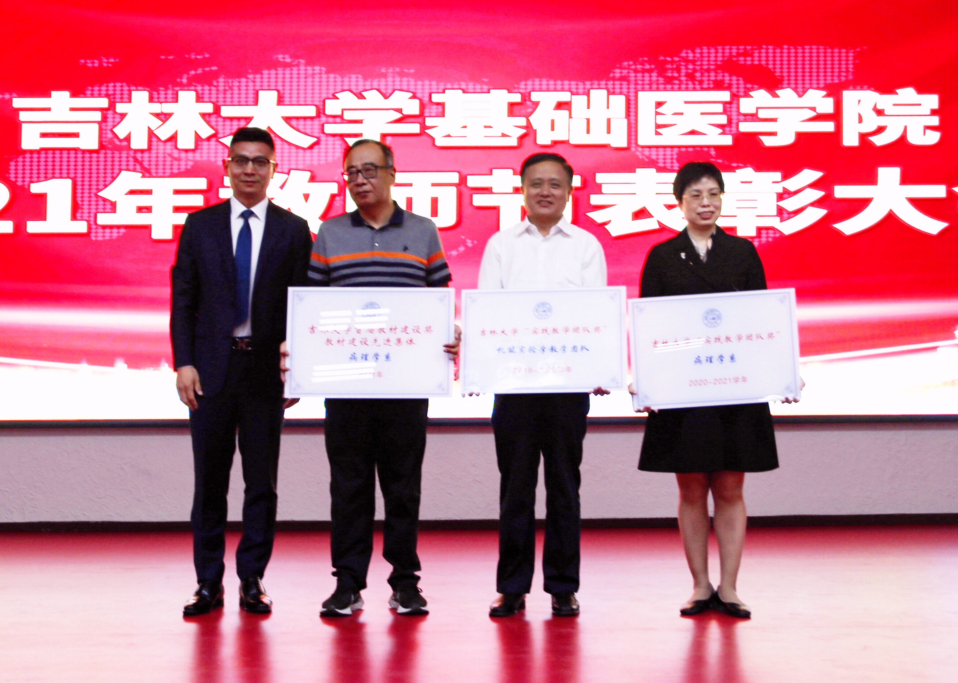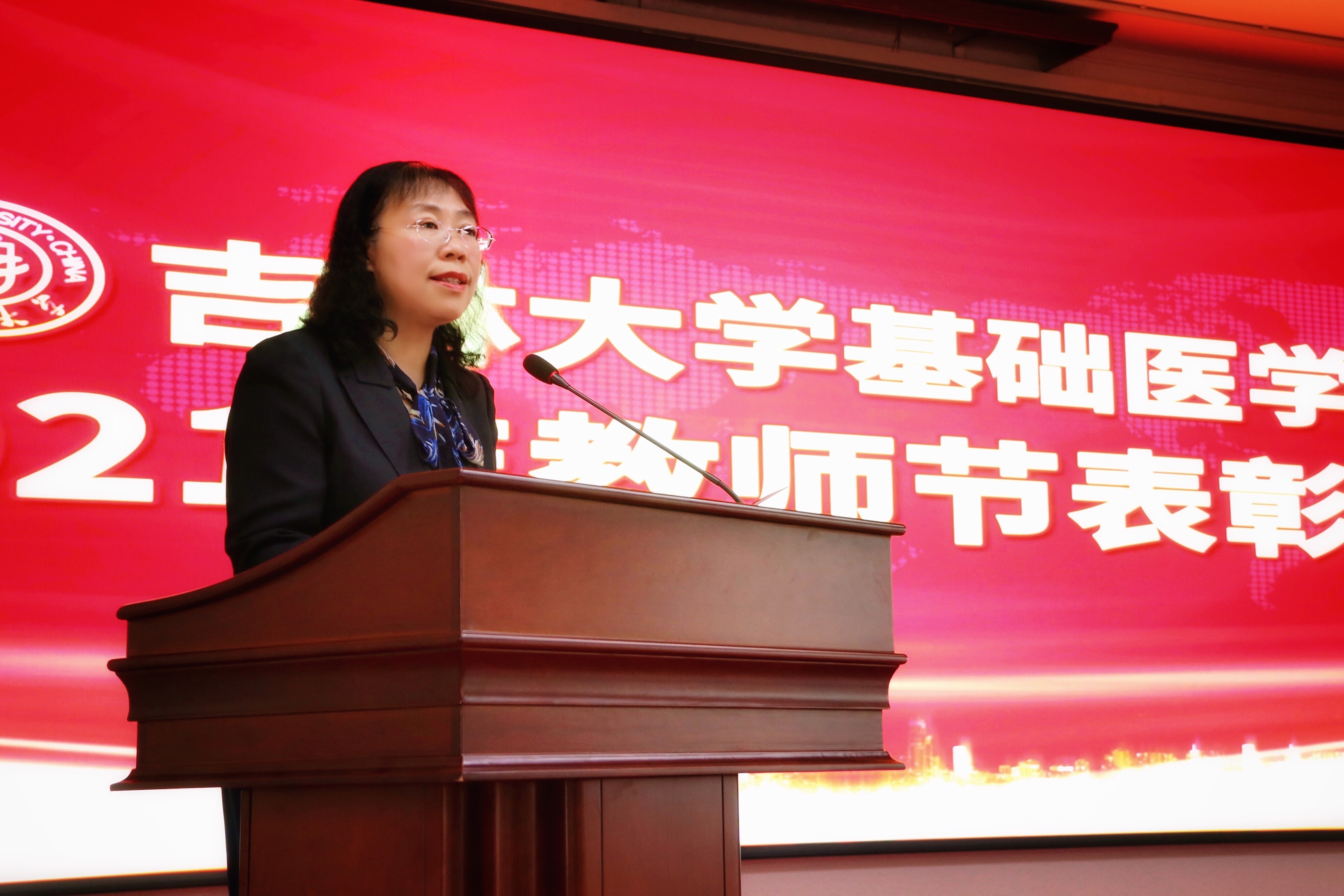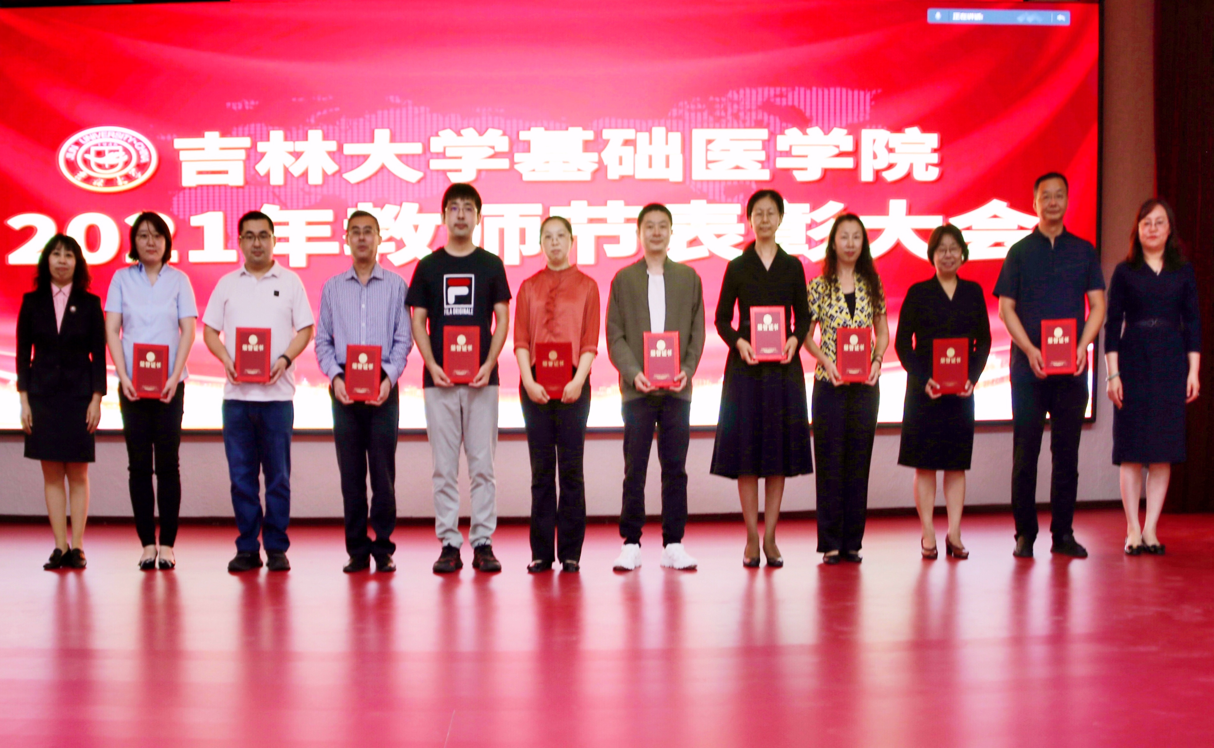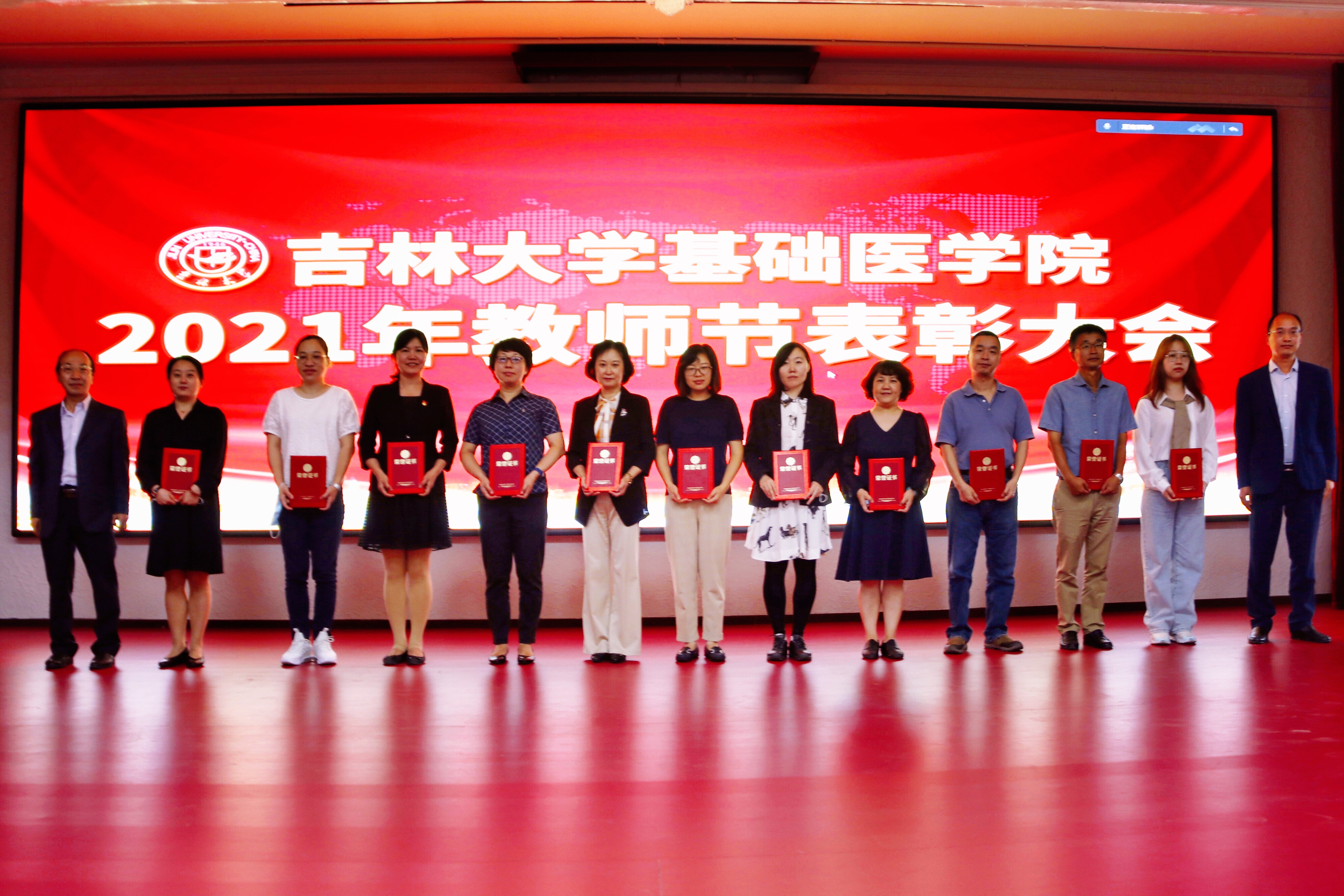 庆祝表彰大会在雄壮的国歌声中开始。首先,由学院党委书记王晓荣宣读了表彰决定,学院授予病理学系等3个团队优秀教师团队称号;王医术等43名教师优秀教师称号;王丽颖等2名教师师德先进个人称号。同时,学院党委号召全院教职工向受表彰的先进集体和个人学习,在深入百年党史学习教育中,赓续红色血脉,传承白求恩精神,为加快医学教育创新发展,推进具有吉大特色的新医科建设和学校双一流建设做出贡献。