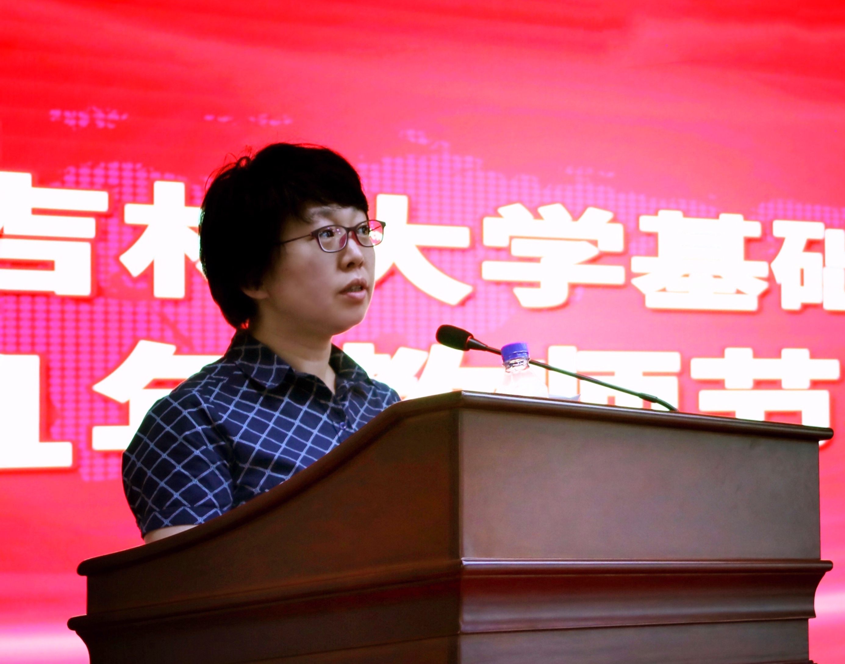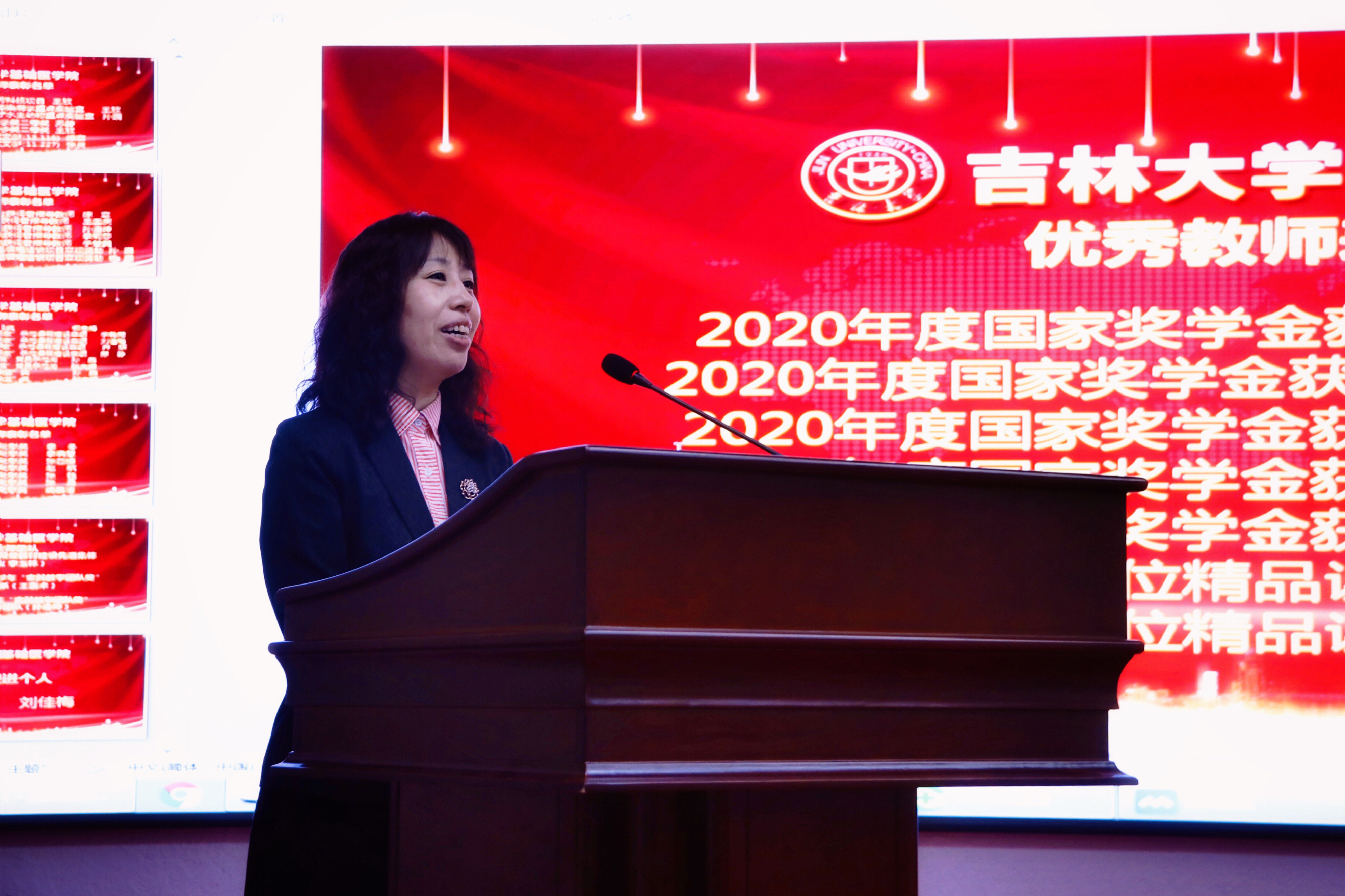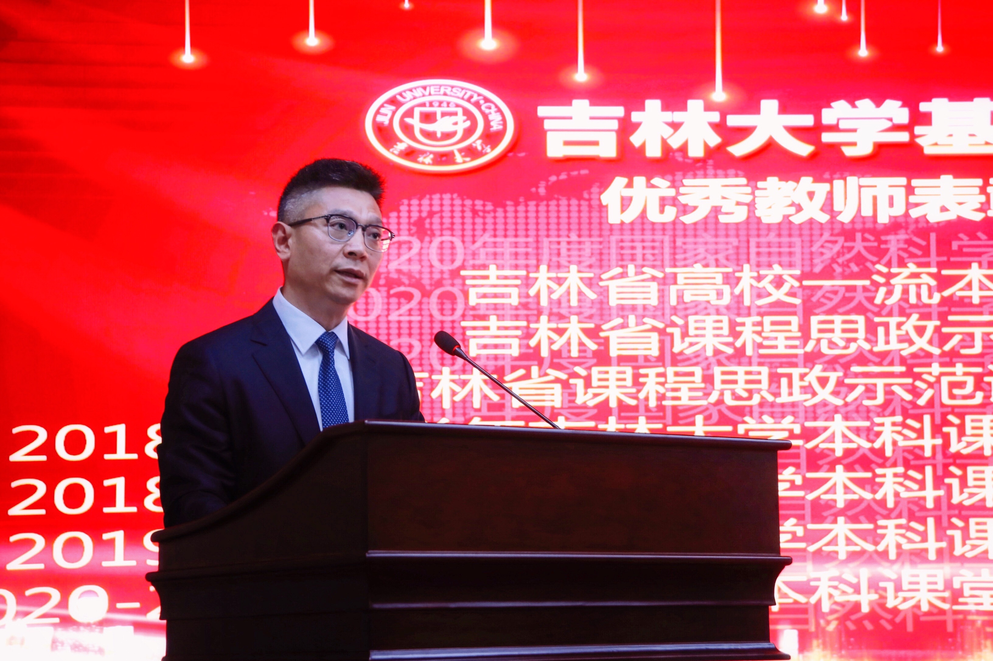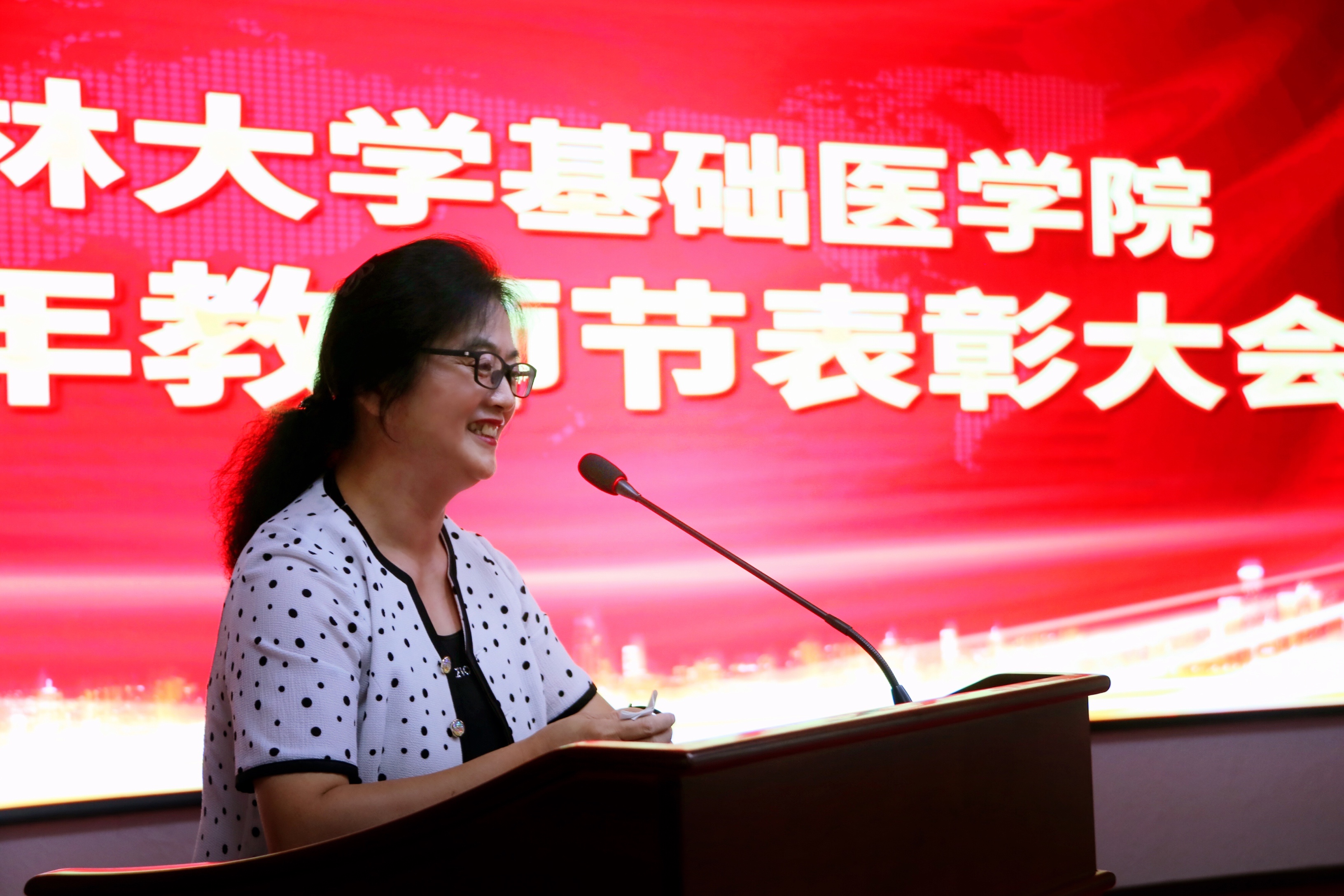 庆祝表彰大会在雄壮的国歌声中开始。首先,由学院党委书记王晓荣宣读了表彰决定,学院授予病理学系等3个团队优秀教师团队称号;王医术等43名教师优秀教师称号;王丽颖等2名教师师德先进个人称号。同时,学院党委号召全院教职工向受表彰的先进集体和个人学习,在深入百年党史学习教育中,赓续红色血脉,传承白求恩精神,为加快医学教育创新发展,推进具有吉大特色的新医科建设和学校双一流建设做出贡献。