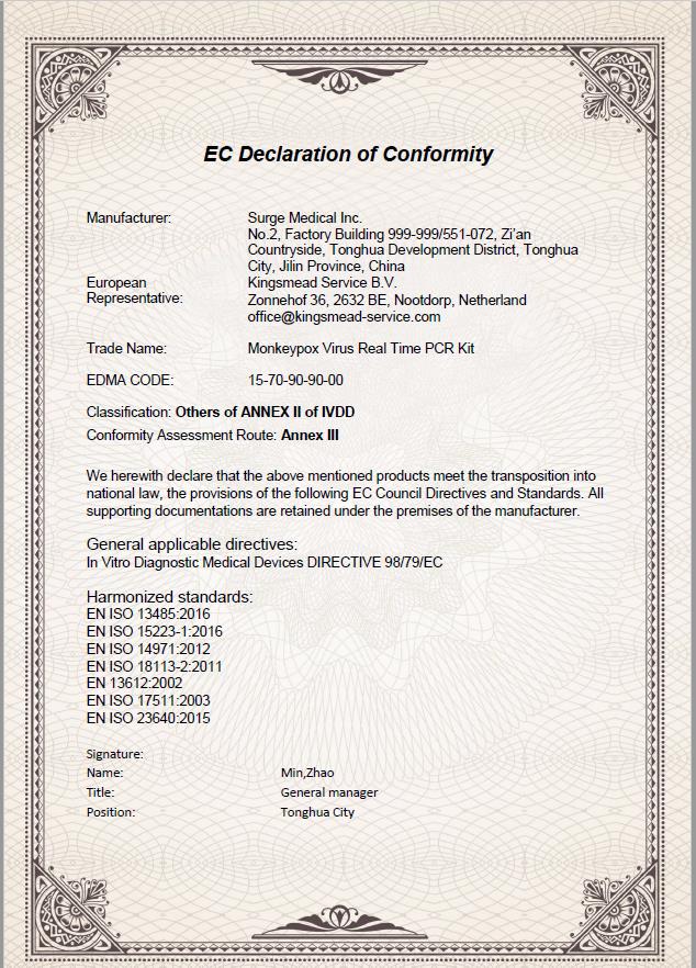 转化医学院、通化市科技局和吉林双正医疗科技有限公司共同签署的“体外诊断试剂POCT研发技术平台”等科研平台,紧急研制出了两种猴痘病毒检测试剂盒——猴痘病毒抗原检测试剂盒(胶体金法)和猴痘病毒核酸检测试剂盒(荧光PCR法),并于2022年5月24日获得了CE认证。这是王放教授团队在传染病诊断检测方面又一重要成果。