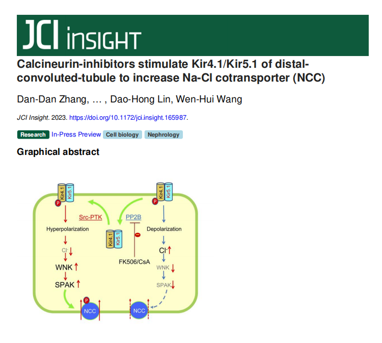 近日,我院唐敖庆青年学者,生理学系张丹丹副教授团队在中科院一区杂志《JCI INSIGHT》(IF9.484)上发表了题为“Calcineurin-inhibitors stimulate Kir4.1/Kir5.1 of distal convoluted-tubule to increase Na-Cl cotransporter (NCC) ”的研究论文。JCI Insight是由美国临床研究协会(American Society for Clinical Investigation)出版的一份同行评审的期刊,在临床前和临床研究领域具有较高的声誉,中科院JCR最新升级版分区表中,该刊分区信息为大类学科医学 1区。