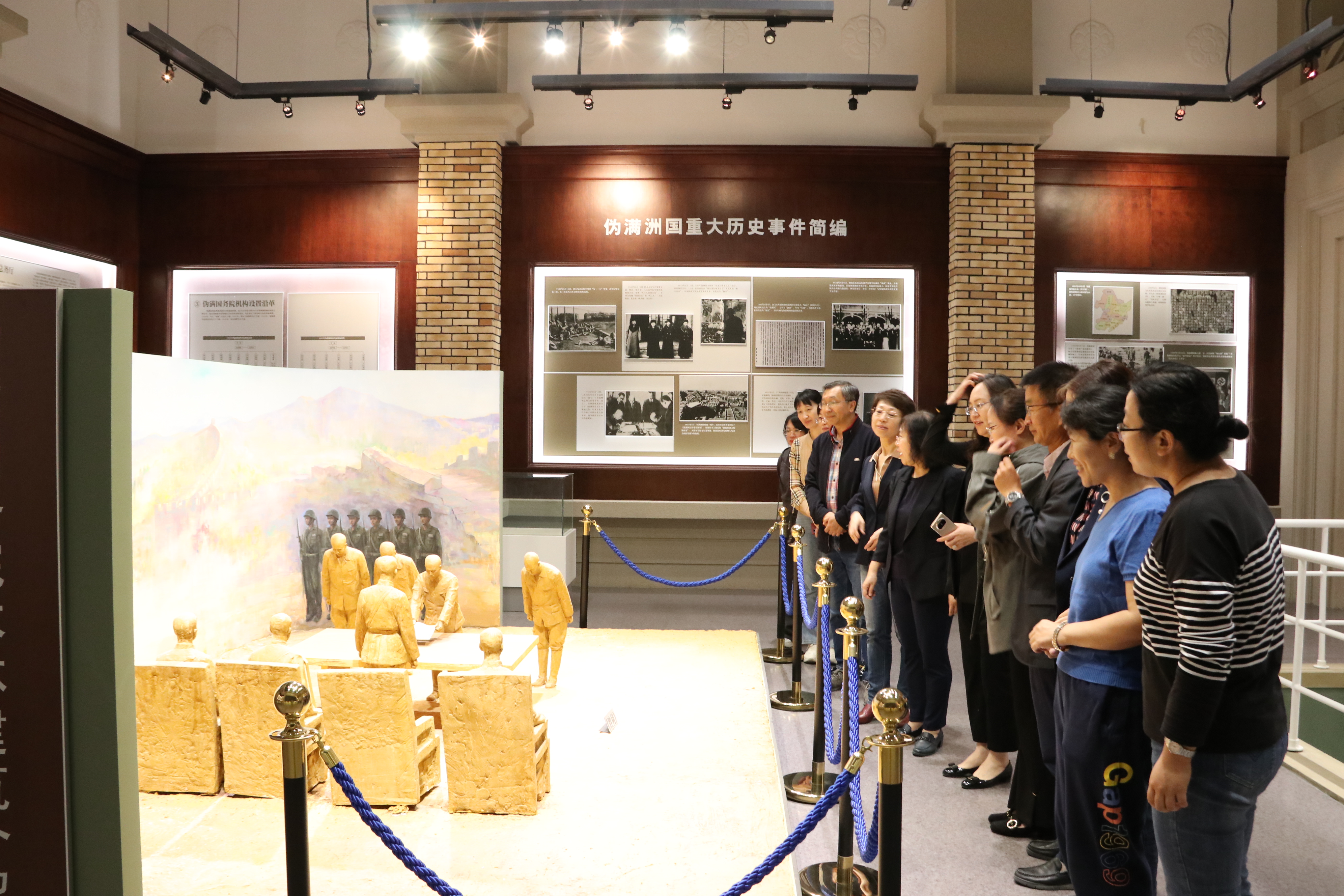在学院党委书记王晓荣的带领下,老师们参观了基础楼五楼的爱国主义教育基地一一伪满洲国警示教育展览馆。这里陈列着伪满国务院大楼的设计与建造的简介、伪满国务院官制、伪满洲国重大历史事件简编、和日本战败递交投降书的人物模型。参观结束后,师生共赴双阳区开展实践研学—参观新农村建设。