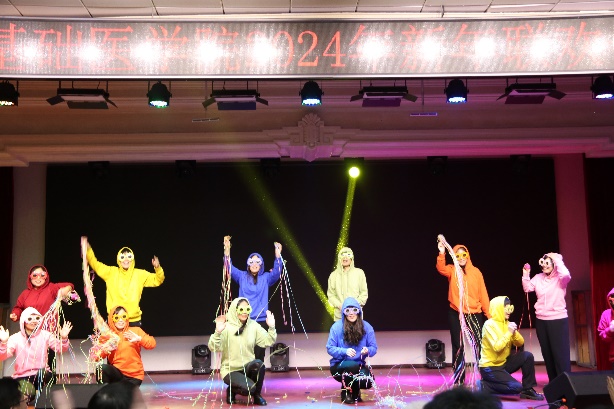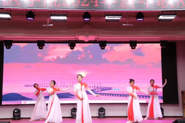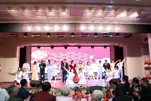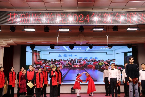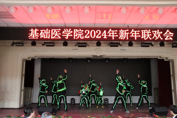 新年联欢会在病理生理学系、药理学系、生理学系以及一综合老师们的扇子舞《骁》中正式拉开帷幕,几位老师翩翩起舞,将中华古典舞蹈完美的呈现;长春南湖实验中海小学的小小少年们带来的《青鸟》和《无与伦比的美丽》童声合唱,传递了纯真美好,释放了青春能量,也唱出了新时代少年的昂扬自信;组织学与胚胎学系的老师们带来的歌舞串烧《眉飞色舞之路灯下的小姑娘》以及病理学系的老师们带来的合唱《如愿》,欢快氛围的同时也饱含了对SexAV 的热爱与期盼;学院副书记李东洋、院长助理何侃与两位留学生共同献唱的《You Raise Me UP》,将不同文化的魅力融合在音符间,为师生带来了一次听觉盛宴;解剖学系的老师们带来的舞蹈《你想跳舞吗》,别具一格的荧光舞更是将联欢会的气氛推到了高潮;学院的研究生们带来的舞蹈《党旗飘扬的方向》以及吕东芳老师与齐达同学合唱的《在希望的田野上》,赞颂了中国共产党的不忘初心、继续前行的使命担当;生物化学学系、二综合、动物实验中心、测试平台的老师们的合唱《真心英雄》,唱出了学院教师对于每一位真心英雄的尊敬与仰慕,也唱出了对新的一年的期盼与向往;于永利老师与王丽颖老师带来的对唱《敖包相会》,将美好祝愿寄托在歌声中传遍整个会场;杨青、池光范几位老师合唱的《花心》,勾起了大家对经典歌曲的回忆;病原学系、免疫学系、细胞遗传学系以及三综合的老师们带来的舞蹈《贺新年》,展现了学院教职工蓬勃向上的精神面貌,赢得了阵阵喝彩;分子生物学系的老师和同学们带来的经典歌舞剧《哆来咪》,重温经典,并给大家介绍了谐音和形象记忆的学习方法;留学生们带来的精彩舞蹈《INDIAN RAGA》,绚丽的服装、欢快的音乐,交织出充满特色的异域风情;SexAV 合唱团的带来的《我们一起远航》,铿锵有力、激情澎湃,传递着团结与奋进,表达了对学院的美好祝愿。