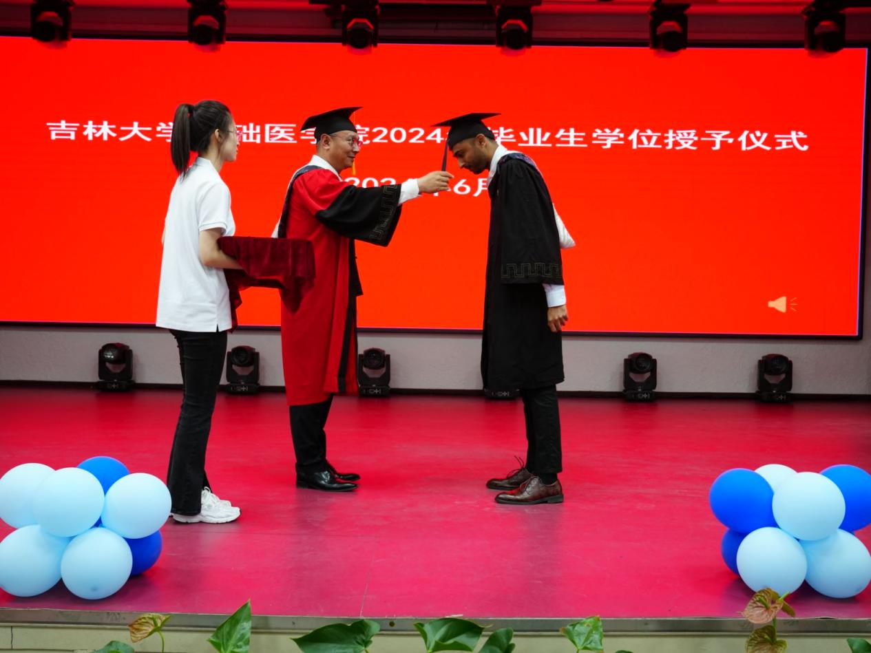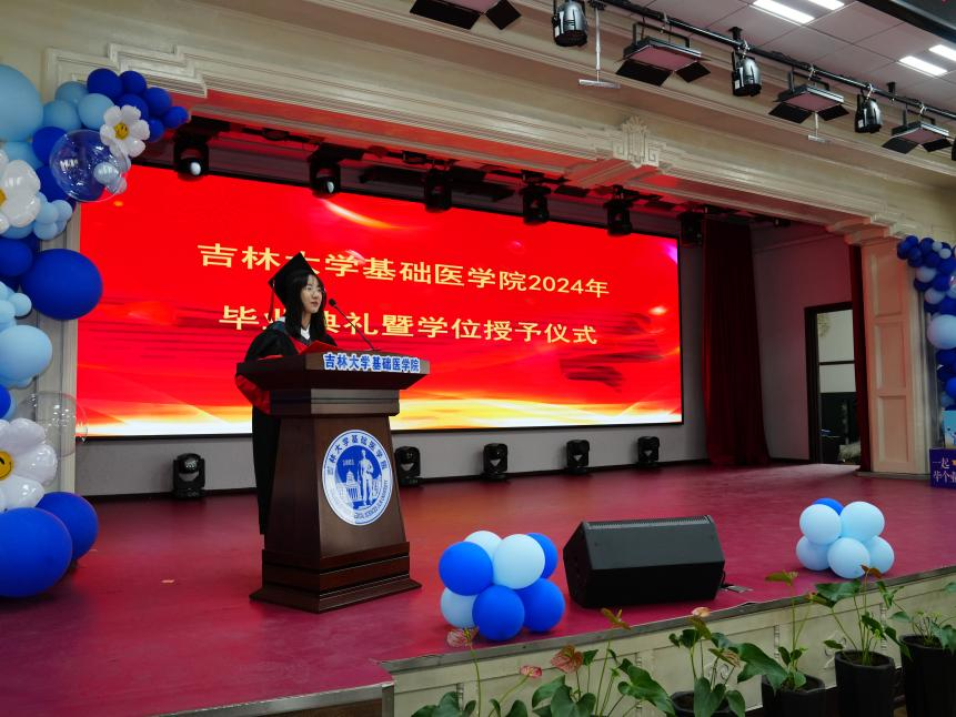 留学生毕业生代表林明烨发言,代表2024届MBBS毕业生,对辛勤培育我们的学院和老师们致以崇高的敬意和诚挚的感谢。很开心在这里认识了来自不同国家的志同道合的朋友,未来的日子里,大家会时刻谨记学院和领导老师的教诲,带着梦想飞得更高,积极投身社会,服务社会。