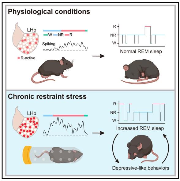 该研究采用了脑电图/肌电图记录、光纤记录、多通道膜片钳技术,以及光遗传学和化学遗传学等多种技术,并利用Fos2A-iCreERT2小鼠进行特异性神经元标记,聚焦LHb的REM睡眠活跃神经元,发现LHb中REM活跃神经元调控正常小鼠的REM睡眠,其活动增强在抑郁所致睡眠障碍的产生中扮演重要角色(详见模式图)。该研究不仅拓展了我们对LHb在睡眠调控中的功能认识,更为未来睡眠障碍的治疗策略提供了新的视角和可能的治疗靶点。