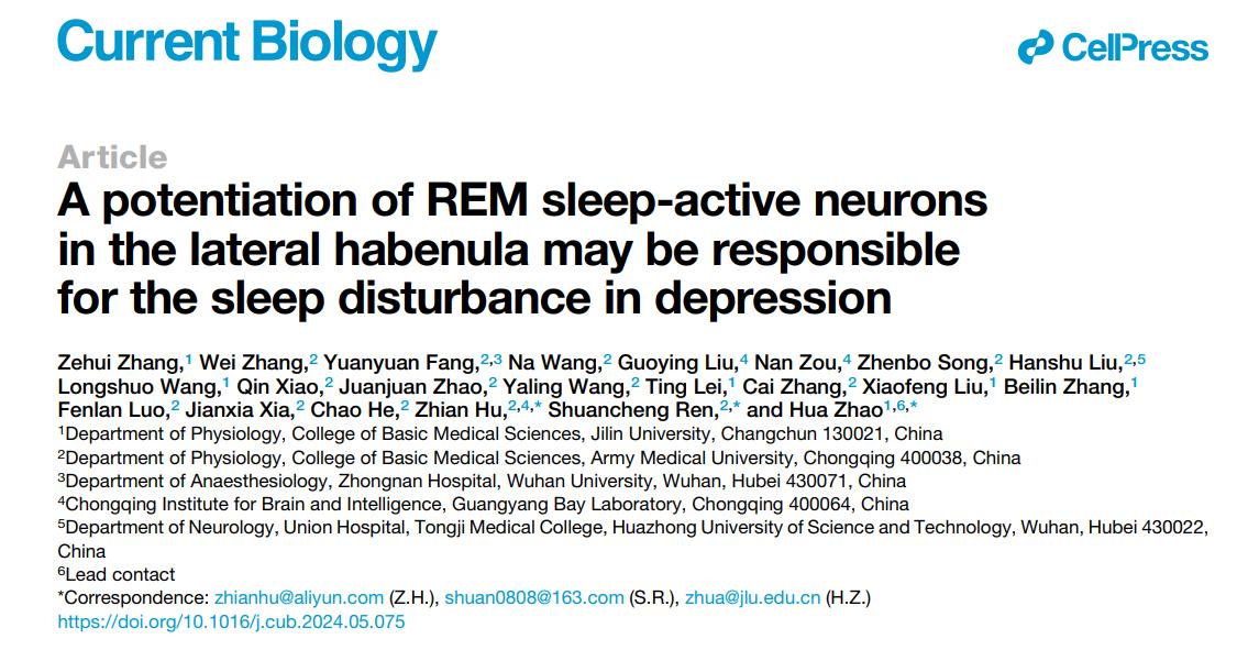 2024年6月29日,我院赵华教授团队、陆军军医大学胡志安/任栓成团队合作在Current Biology在线发表题为 “A potentiation of REM sleep-active neurons in the lateral habenula may be responsible for the sleep disturbance in depression”的研究论文。该研究证明LHb的REM睡眠活跃神经元在抑郁症所致睡眠障碍中具有不可或缺的作用,这一发现不仅确定了抑郁所致睡眠障碍发病中一个新靶点及其潜在机制,更为临床防治抑郁睡眠障碍提出了新策略。 Current Biology 是发表生物学领域研究的国际顶级刊物,中科院分区为1区的TOP期刊,最新影响因子8.1(SexAV
