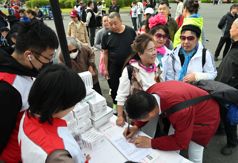 “健康公益行” 志愿者徒步队伍沿南湖湖堤组成蜿蜒的红色纽带,全体成员参与“一块走”捐步,以5800步捐0.5 元公益金的方式为 “温暖家庭箱” 项目募集善款,徒步队伍成为了流动的人道关爱课堂。行进间,志愿者向沿途市民发放 “三救三献” 宣传资料,重点普及遗体与器官捐献知识。“每个生命的终点都可能是他人新生的起点...”志愿者的讲解引发了社会共鸣,不少市民驻足咨询,使生命延续的理念随活动的脚步传递。