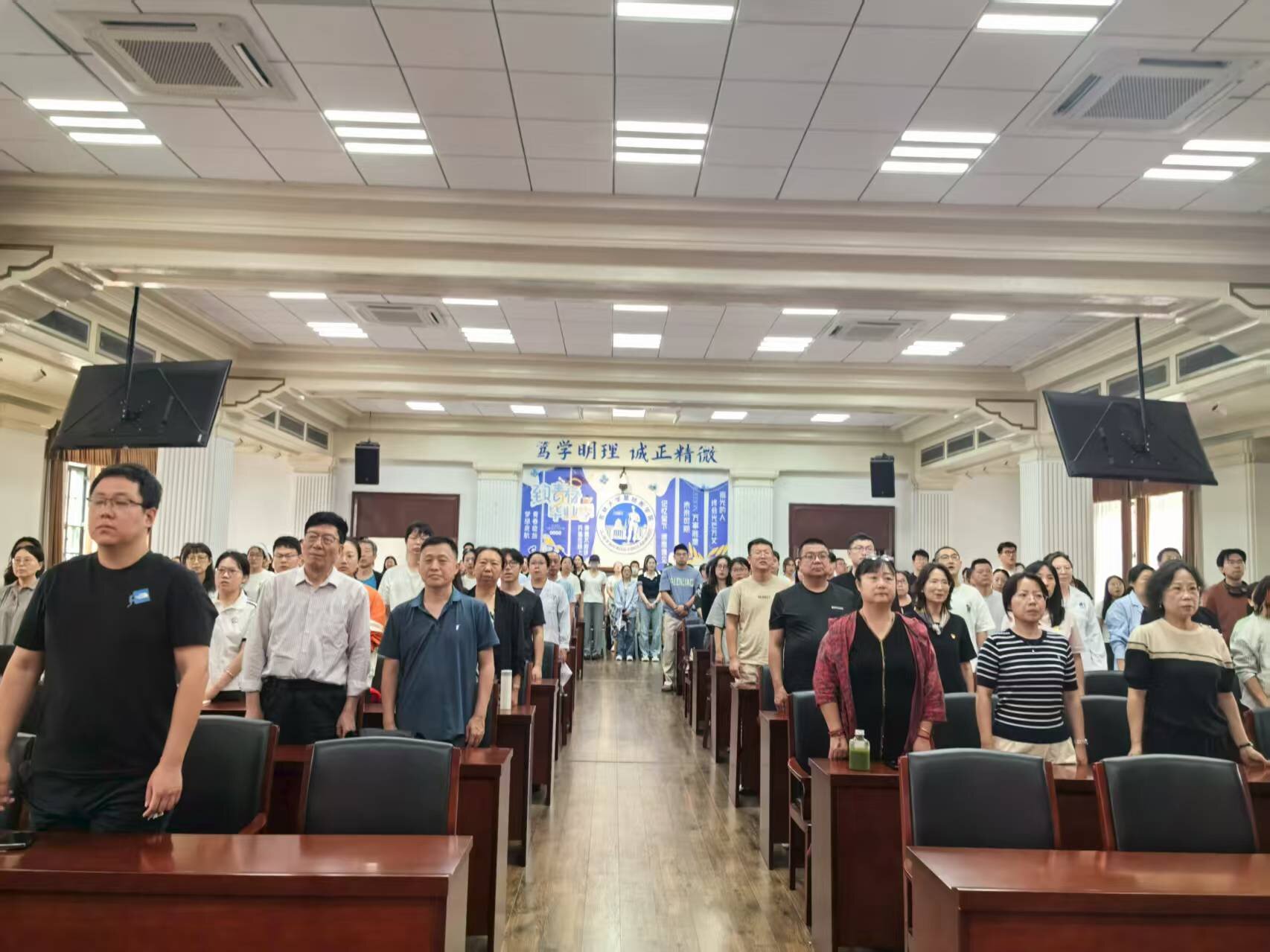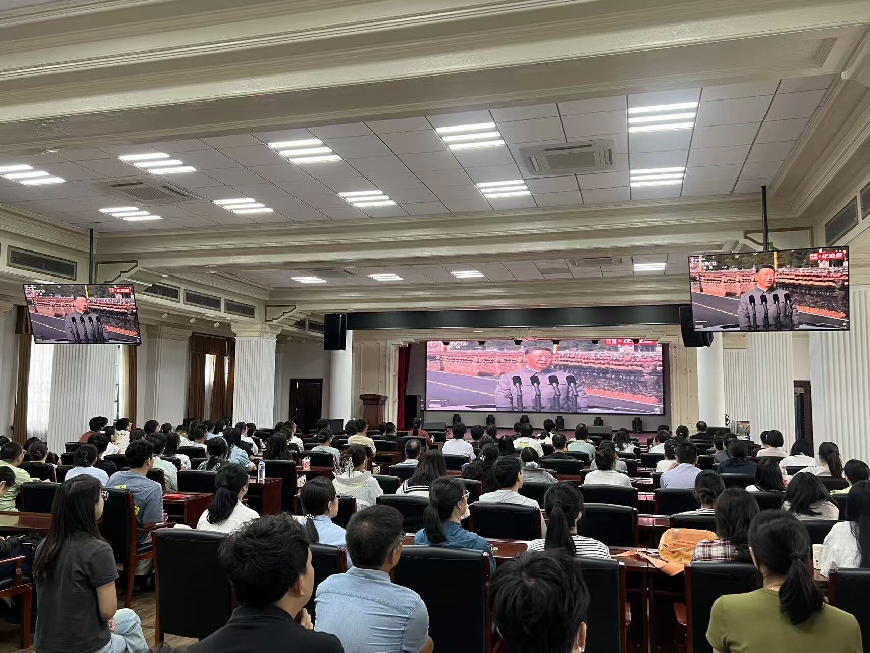 党委组织全院200余名师生在二楼报告厅集体观看纪念中国人民抗日战争暨世界反法西斯战争胜利80周年大会及阅兵式,共同铭记历史、缅怀先烈、珍爱和平、开创未来。