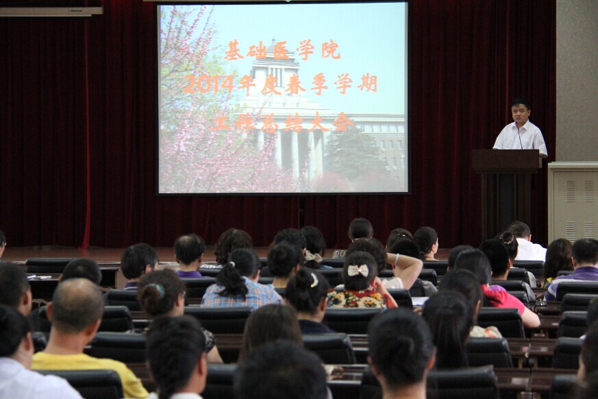 在二楼学术报告厅召开2014年度春季学期工作总结大会,党委书记孙赵华、院长孙连坤等学院领导、全体教职工参加了会议。