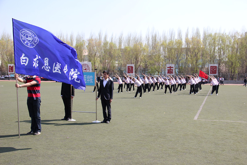 节奏欢快的广播体操乐曲铿锵有力的回荡在操场中,也将激烈的比赛拉开了帷幕。白求恩医学院代表队首先上场。参赛队员着装统一,信心饱满,动作规范标准,整齐划一,赢得评委和观众的认可,成绩斐然。