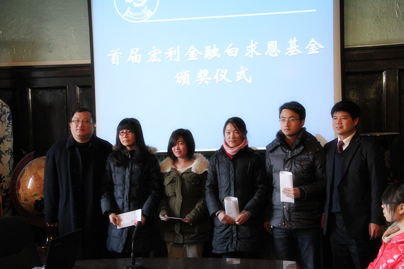 随后,吴剑锋宣读2011年宏利白求恩奖学金、助学金获得者名单。屈英和、姚兵为获奖学生颁发奖金并合影留念。接下来,宏利奖学金获得者陈雪东作为获奖代表发言。他表示要将白求恩精神化为个人前进的动力,用爱心回报社会、用行动践行誓言;2011年宏利助学金获得者王焕彬及张春雷的诗朗诵《荣光》,通过回顾白求恩短暂而伟大的一生,使大家感悟到医者不仅要有高超的医术,更应有对生命的崇敬;2011年唐县牛眼沟村白求恩希望小学支教小分队代表刘相良对于支教经历的讲述,体现当代白医人对白求恩足迹的追寻和对白求恩精神的传承。
