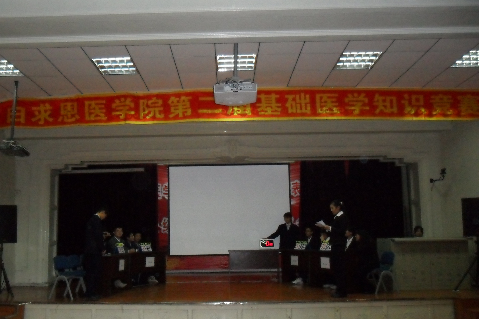 为加强医学生对基础医学知识的掌握程度、活跃学术气氛、加强学院医学人文环境建设,11月3日晚,白求恩医学院第二届基础医学知识竞赛决赛在基础楼二楼多功能学术报告厅隆重举办。担任本次竞赛的评委有吉林省解剖学会常务理事兼秘书长、白求恩医学院人体解剖学系教授李幼琼、白求恩医学院生物化学教研室副教授刘畅及生理学系讲师于蕾,白求恩医学院党委副书记兼副院长苑锐也应邀参加了本次活动。
