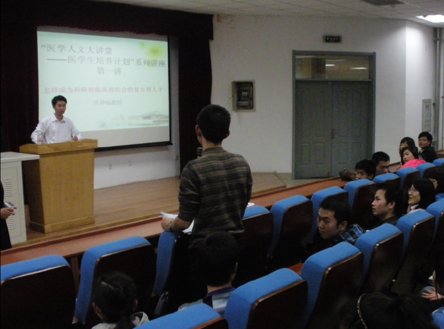 随后,许教授与现场同学进行了互动交流。对同学们的基础知识学习和临床知识学习进行了指导,使在场的同学受益匪浅。本期医学人文大讲堂在热烈的气氛中结束。(学生记者 刘水)