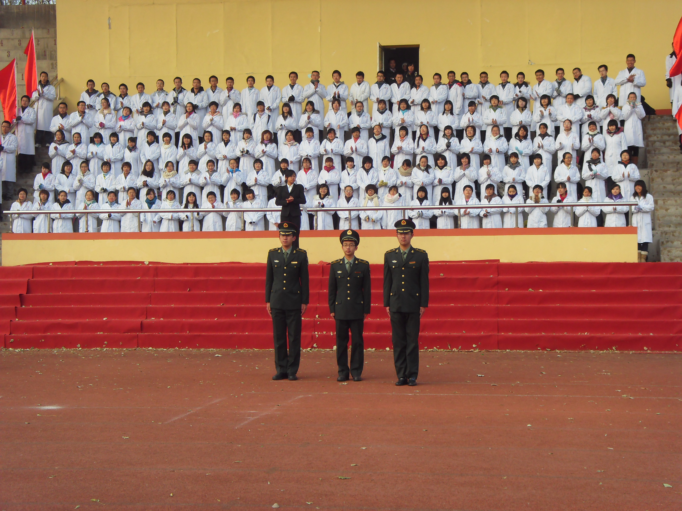 白求恩医学院2010级年级长李建男担任升旗手,基础园区学生会团委副书记兼学院2010级体育部部长邹运、2010级医学试验班团支书朱宇航担任护旗手,他们和同学们组成的国旗护卫队意气风发,迈着整齐的步伐、庄重而肃穆的护送着国旗走向升旗台。学院2010级长学制所有女同学则身着一袭白衣,以准医生的身份立誓为国家效力,并以一首响亮的《红旗飘飘》表达了对红旗的热爱、对祖国的赤诚。