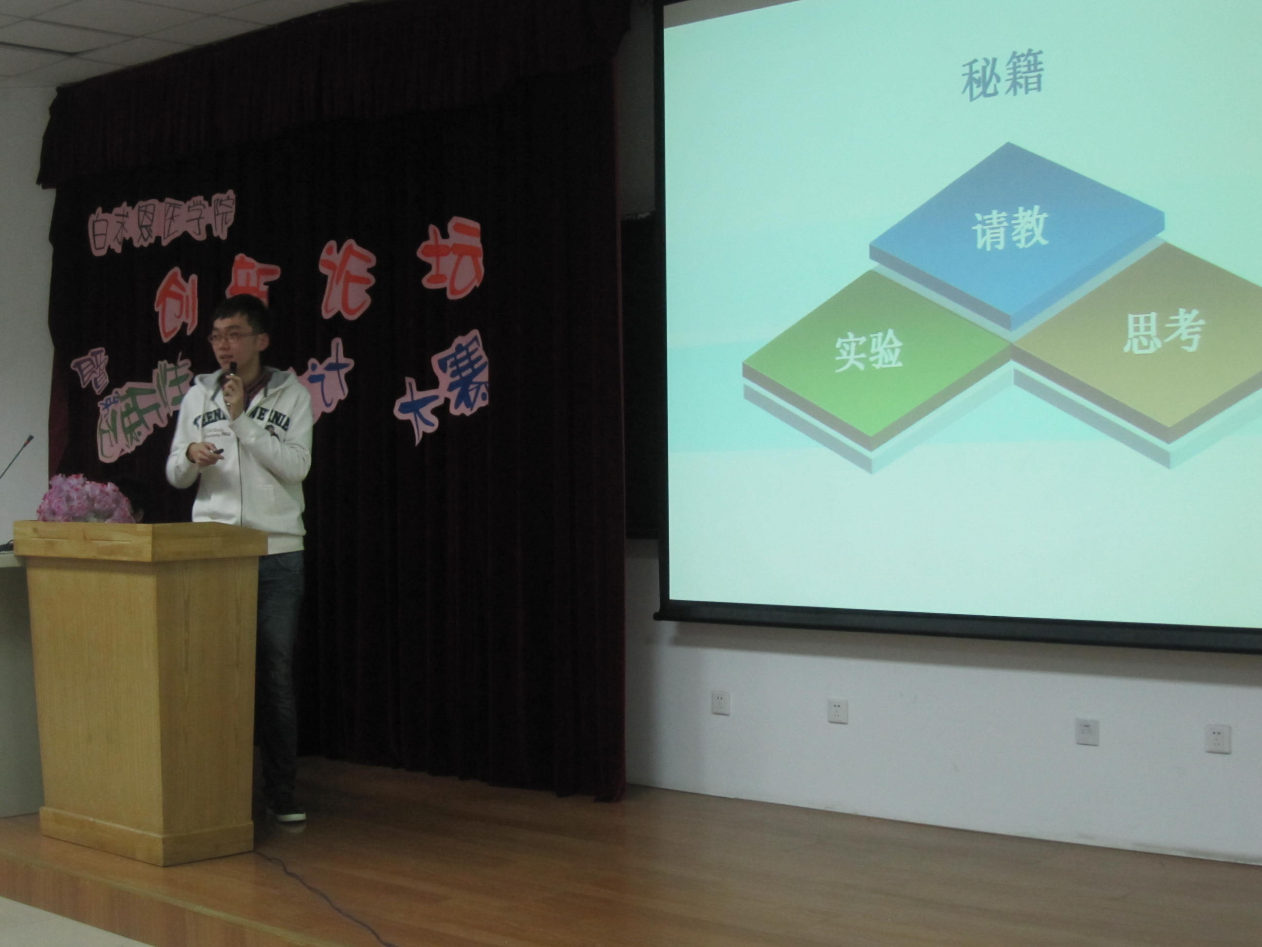 首先,白求恩医学院学生会主席刘兴任致开幕辞,他号召全体同学掌握扎实的基础,提升创新的思维,插上创新的翅膀自由飞翔。随后,经过初赛选拔出的五位选手分别就“特异性的激活和抑制水通道蛋白及氯离子对喉癌细胞的凋亡影响”、“抗体进入细胞核内会怎样”、“钙离子在皮肤修复中不可缺少,探究最佳促使皮肤修复的钙离子浓度,减少修复型保湿剂对皮肤的损伤”、“木香提取物治疗急慢性胃溃疡”、“通过提取丝氨酸蛋白酶中的有效结构域,对味觉中影响咸味的传导机制进行调控,从而达到减少食盐摄入量、控制高血压的目的”五项内容进行了阐述。选手们分别从背景资料、实验设计、结果预期和未来展望几个方面进行论述后,评委们进行了提问。选手们或慷慨自信的进行实验设计陈述,或虚心谦逊的接受评委老师的指导。现场的观众也积极参与,提出自己的疑问,与参赛选手进行交流。最终,由徐永明、董航、刘轶组成的团队获得一等奖。