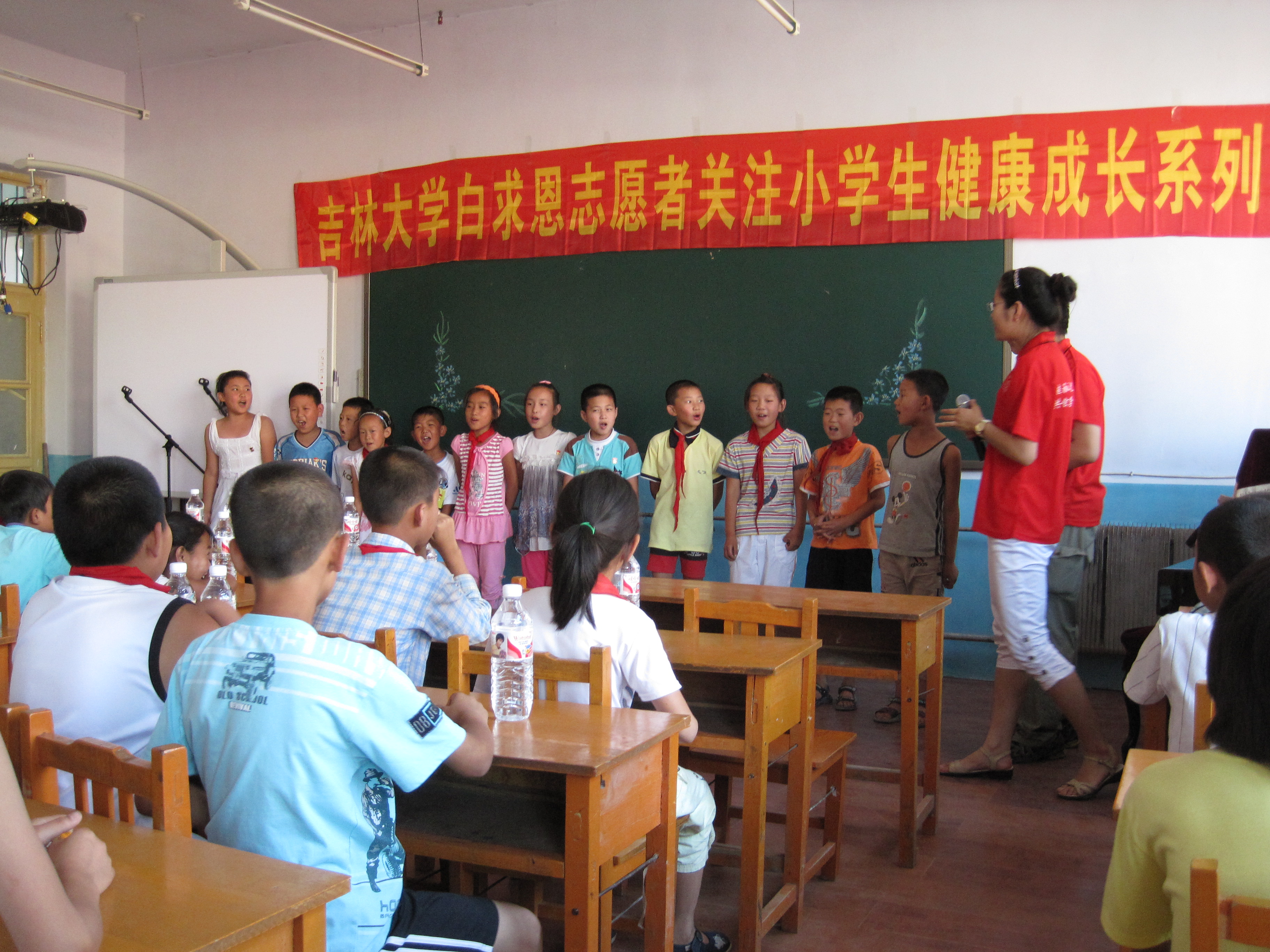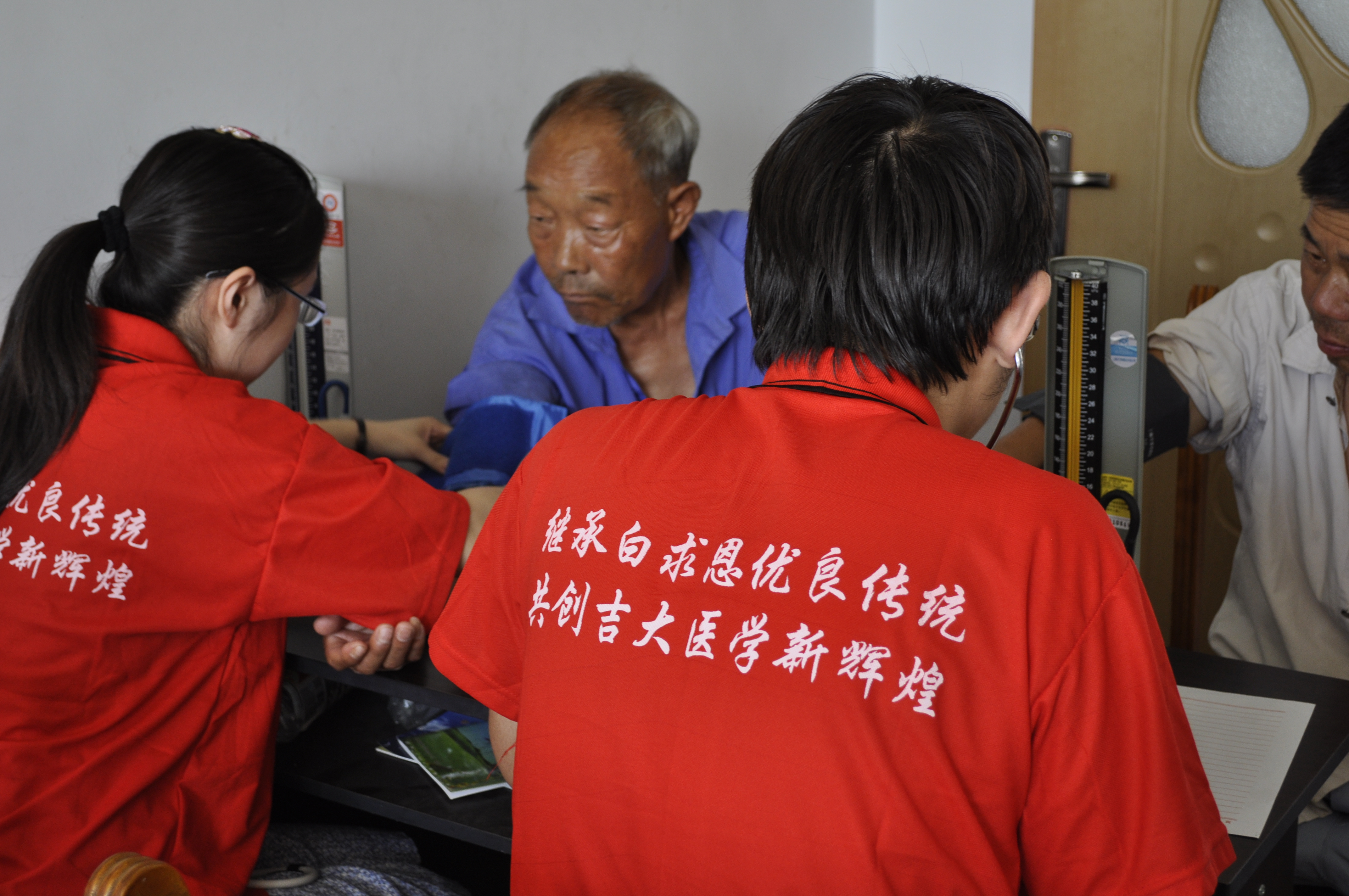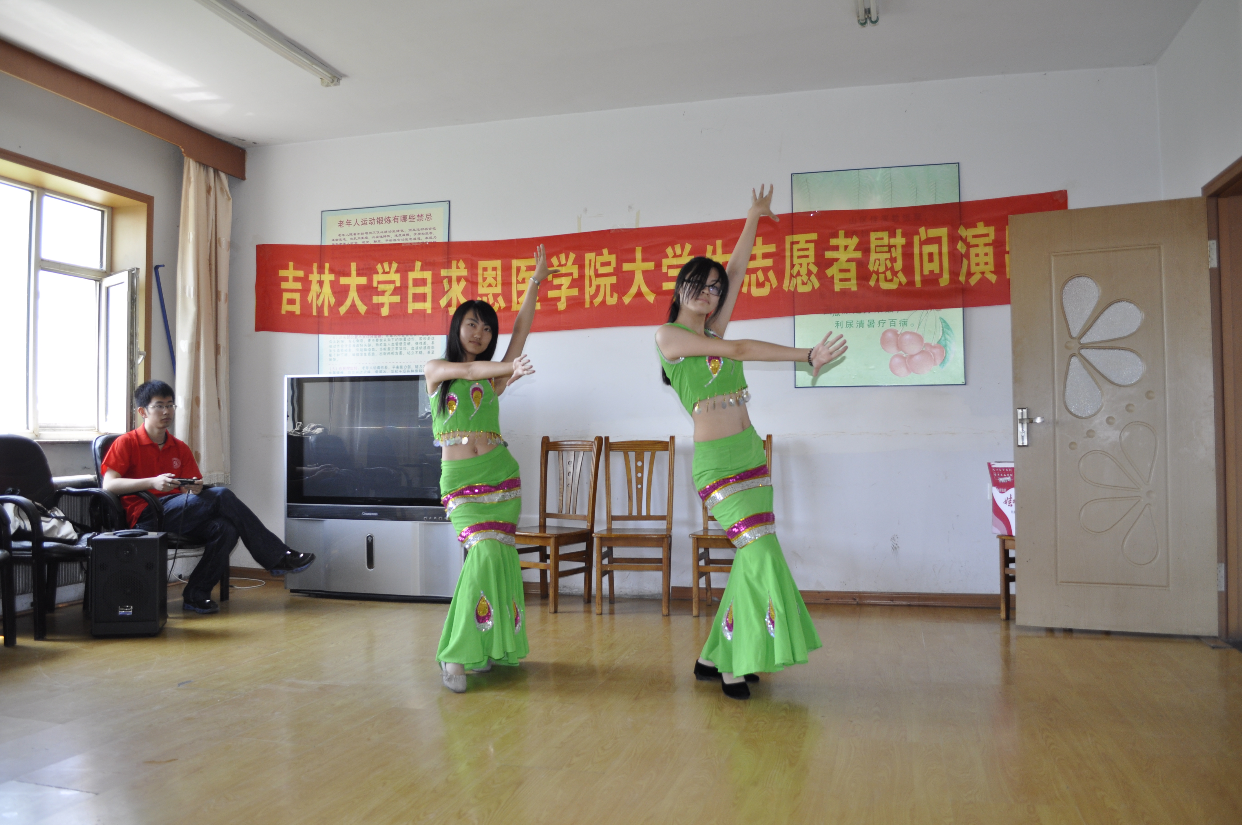 签约仪式后,白求恩医学院大学生志愿者分成两个小分队分别在乐山镇社会福利服务中心和乐山镇中心小学进行了志愿服务工作。在乐山镇社会福利服务中心,大学生志愿者们为孤寡老人献上了一台精彩的文艺演出,刚柔并济的武术表演、深沉幽远的乐器独奏、悠扬柔美的粤语歌和傣族舞,博得了老人们的声声欢笑和阵阵掌声。同时,志愿者还为老人们提供了医疗服务与咨询,深受老人们的欢迎。在乐山镇中心小学,大学生志愿者们与小朋友一起做起了“命名游戏”。快乐的游戏让小朋友们懂得了梦想的重要价值,增强了他们的团队意识和集体荣誉感。