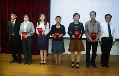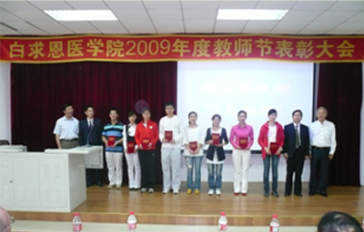 在第25个教师节来临之际,白求恩医学院于9月10日下午在新民校区第二教学楼2402教室举行2009年教师节表彰大会。白求恩医学院党委书记屈英和、常务副院长孙连坤、白求恩医学部副学部长侯治富、教务处副处长金祥雷、吴运涛、第一临床学院副院长牛俊奇、白求恩医学院领导、部分外籍专家、教师代表和学生代表参加了大会。大会由白求恩医学院副院长程丕显主持。
