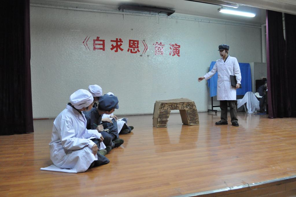 随后进行了话剧《白求恩》的首演。《白求恩》是白求恩医学院学生自编自导自演的话剧,话剧从不同的角度演绎了白求恩对伤员的认真负责、对医学的严谨求实、对战友的手足情谊以及对中国抗日战争做出的突出贡献。《白求恩》的首演掀起了本次文化节开幕式的高潮。同学们对白求恩精神的深刻领悟和精彩演绎震撼了现场所有观众,细腻的表演技巧、情感的真实投入、振奋的经典旁白,博得了现场经久不息的掌声。现场的同学纷纷表示作为白求恩的传人一定会在白求恩精神的感召下,求真务实、严谨细致,秉承白求恩品质,传承白求恩精神,早日成为祖国建设的栋梁之才。