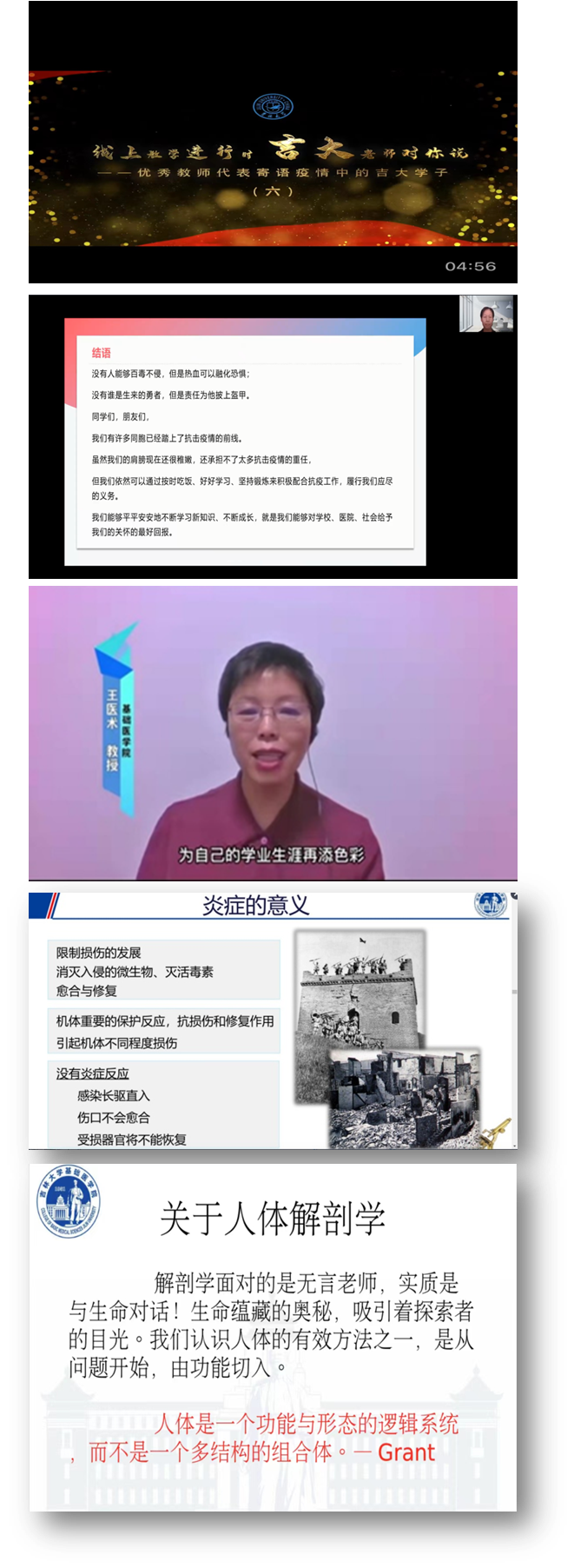 一、播放寄语事迹,落在细上,坚持细处着眼、润物无声,培养学生的情怀。如病理学系的授课教师精心为学生录制了教师寄语,告诉学生如何在云端进行学习,用温暖的话语鼓励学生,并在知识的传授中,以学生熟知的抗日战争与病理学课程中的炎症做类比,既可以使学生更好地理解炎症这一抽象的病理过程,又可激发学生的勿忘国耻、奋发图强的爱国情怀。病理生理学系教师在缺氧这个章节中设计了涵盖低张性缺氧机制为案例的英雄事迹,进行知识传授与爱国主义教育,在讨论疾病发生机制的同时引入了十八军“背着公路”进西藏的英雄事迹。法医学系教师在向同学讲授医疗事故章节知识时,介绍了医疗事故的真实案例,从而让学生了解易于引发纠纷及事故的常见原因,增强临床医生的临床工作责任心。解剖学系教师上课时向同学介绍了解剖学课程的实验标本均为捐献者提供的遗体,立典型事迹的同时,组织祭奠仪式,向大体老师致敬,并组织学生进行更深度的挖掘,编辑每一个遗体捐献者的故事,让其无私奉献的精神得到更为广泛的传承。细胞生物学系教师在讲授细胞课程时,通过以饥饿细胞后细胞能量的储存行为作为导入,引出细胞生物学主要的学习内容,进而过渡到疫情期间,同学们要学会储备知识,为医学贡献自己的力量。