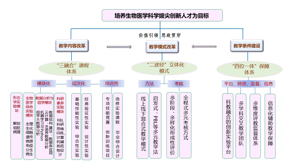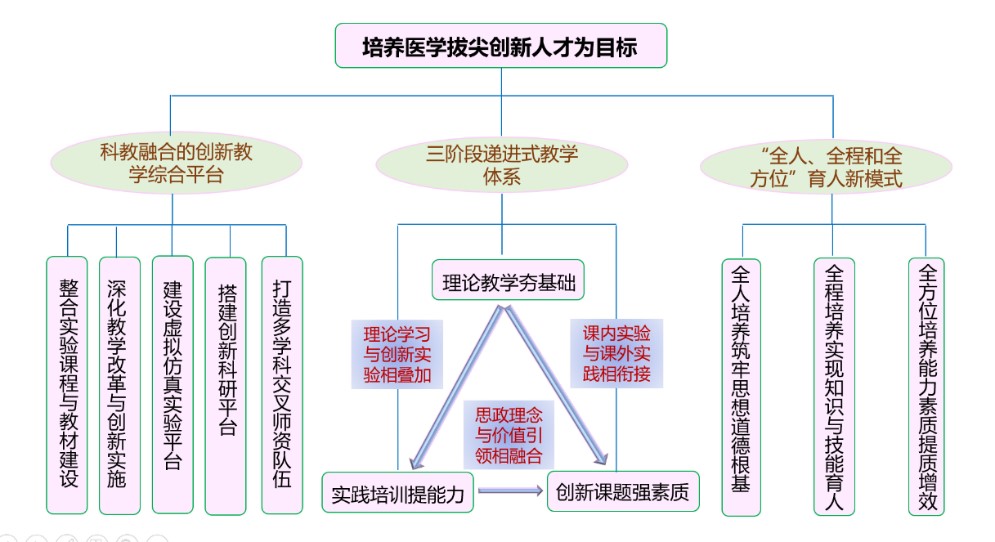 学院以“重基础,促创新,提能力,强素质”为教育理念,基于“课内实验与课外实践相衔接,理论学习与创新实验相叠加,思政理念与价值引领相融合”的原则,将科研能力培养融于教学环节,建设科教融合的医学创新人才培养教学平台与团队,打造“理论教学夯基础—实践培训提能力—创新课题强素质”的三阶段递进式创新人才培养教学体系,以“全员育人、全程育人、全方位育人”实现服务生命健康事业的创新型医学本科人才的培养。