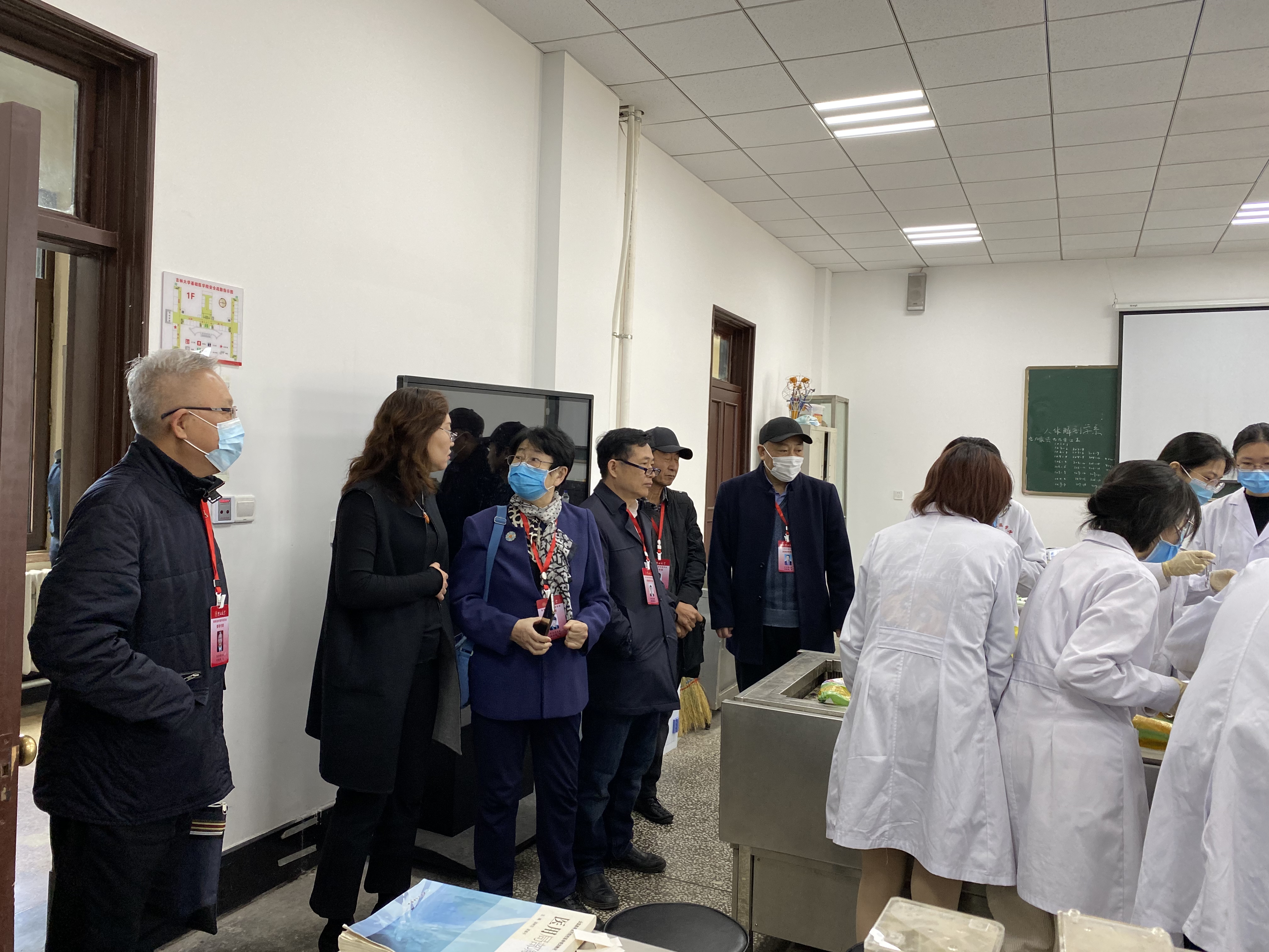 校教育教学督导专家委员会副主任委员迟宝荣教授、专家吴运涛、李一、侯治富、李忠民、睢大筼、续薇一行7人首先来到解剖实验室,检查了局部解剖学实验课授课情况,并与2018级临床医学5+3学生代表进行了座谈,了解课程思政实施情况。随后专家组来到基础楼四楼会议室,调阅了病理学、病理生理学、组织学与胚胎学、免疫学、药理学、生理学6个学系的教师教案40余份。