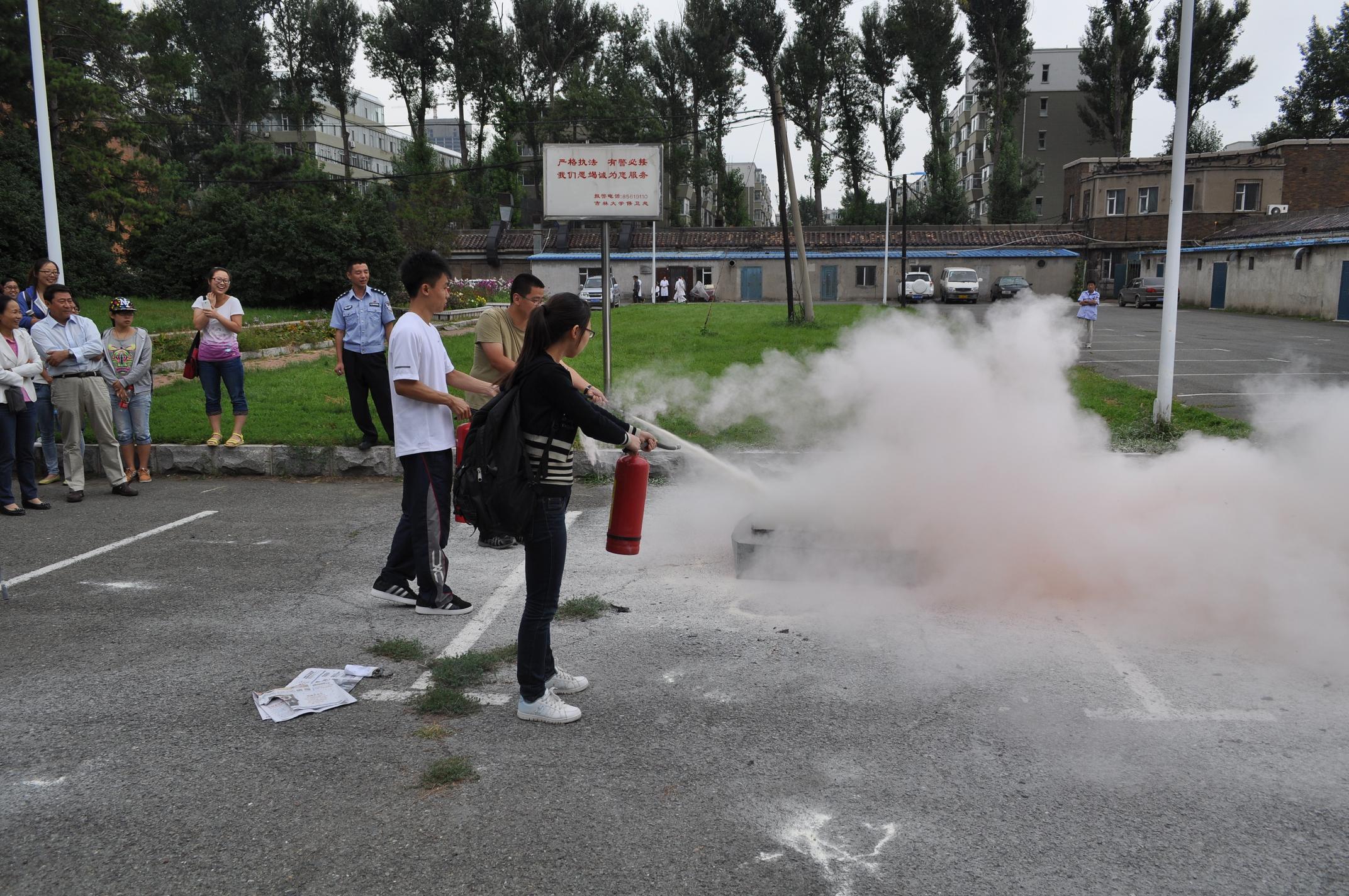培训会后,师生一起到基础楼南门的空地上参加防火演练。在安志成的现场指导下,参训师生表现积极,场面十分热烈。学院党委书记孙赵华带领师生实际操作了灭火器,顺利扑灭了引燃的汽油。