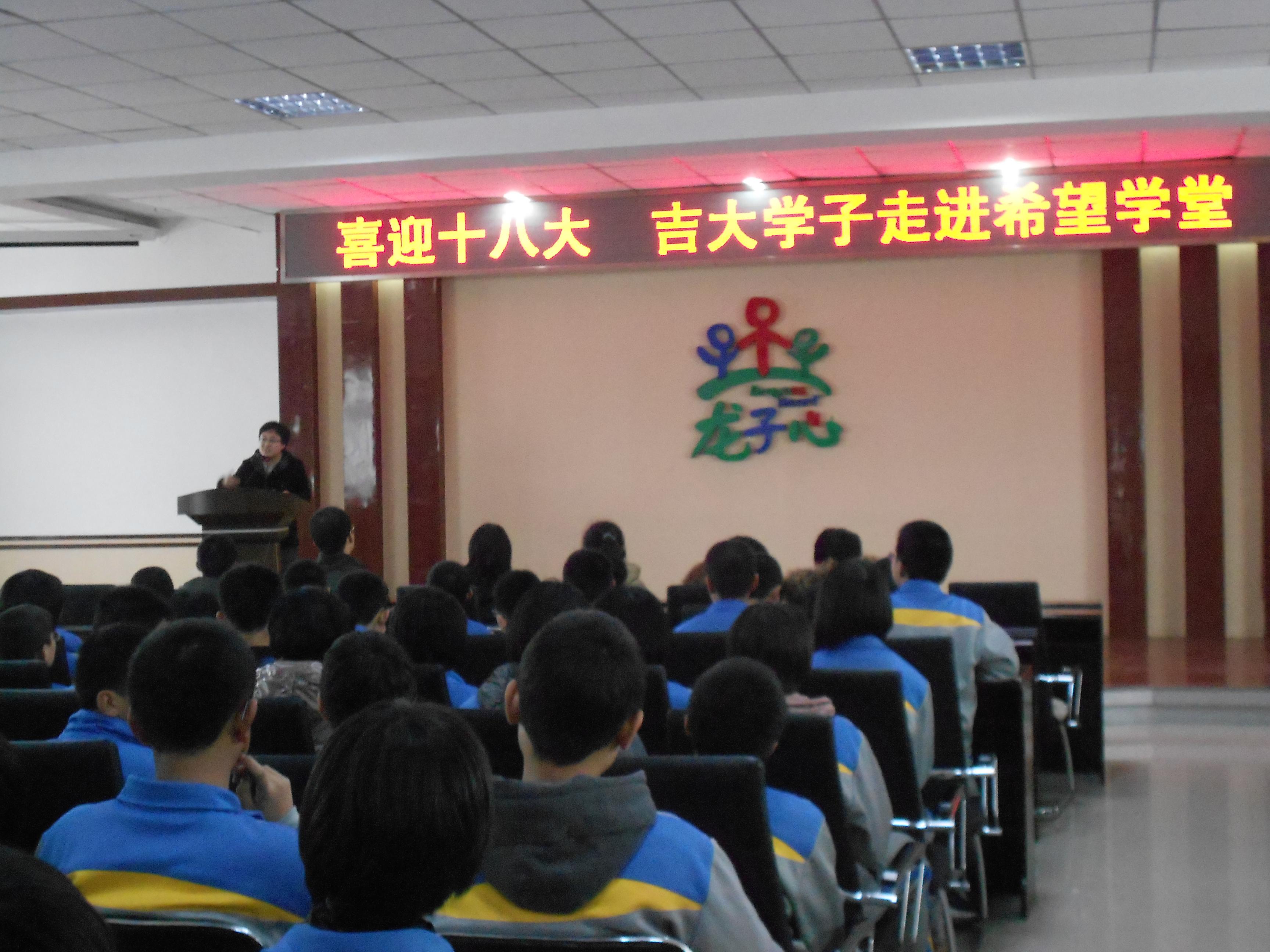 为落实“弘扬白求恩精神,创建‘五个一’党支部”项目活动内容,11月13日下午,白求恩医学院2011级硕士党支部一行10人冒雪前往长春市龙子心希望学校,开展主题为“喜迎十八大 吉大学子走进希望学堂”学习经验交流活动。长春市龙子心希望学校初中二年级学生200余人参加了活动。